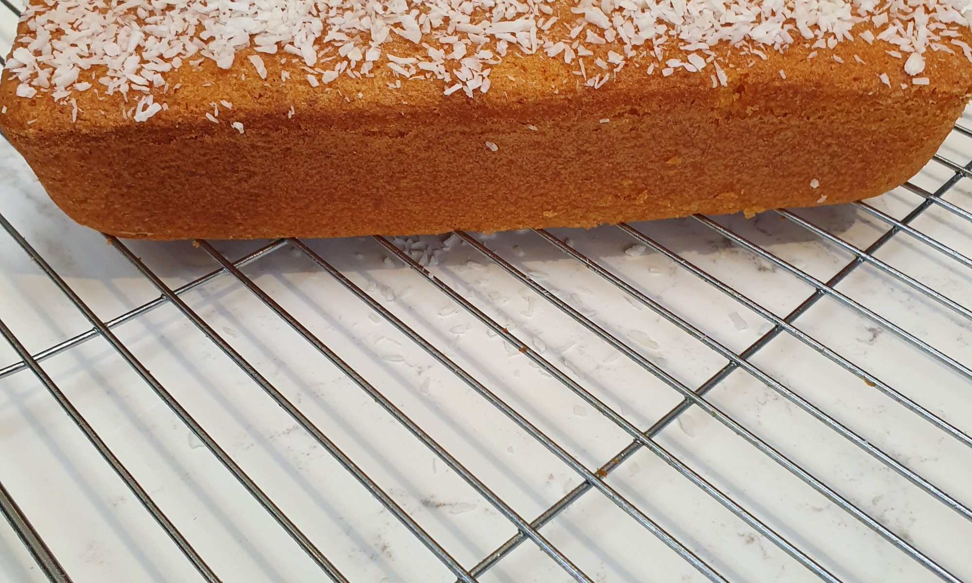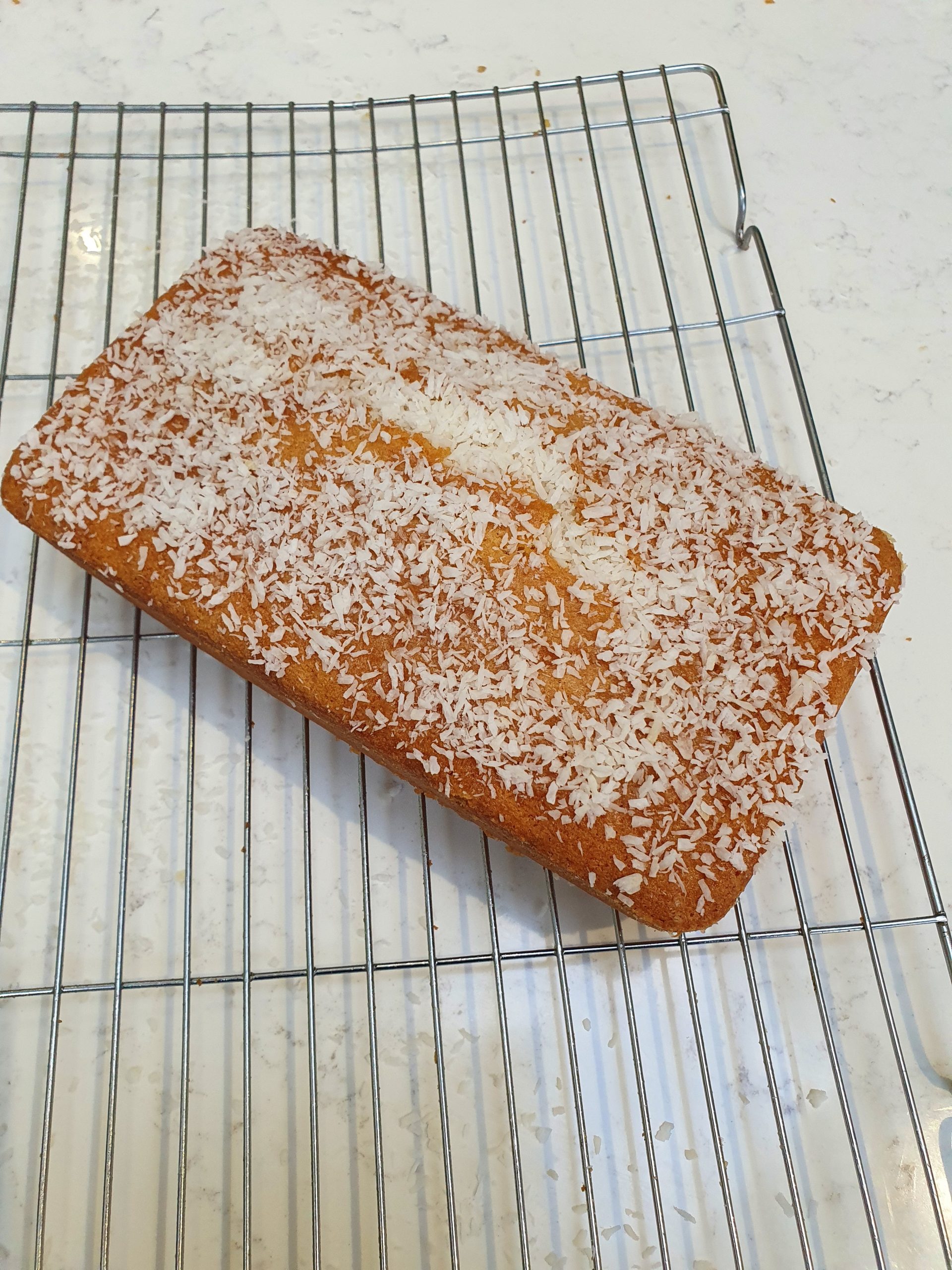 Delicious coconut flavoured loaf sprinkled with coconut flakes